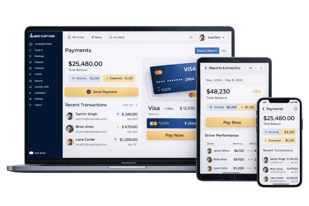 Modern Payment Gateway Features for Growth A modern payment gateway offers more than just processing. Limo Captain provides automatic invoice generation for every trip. Our system supports both full and partial refunds with clear tracking. You can view a complete transaction and payment history in one place. This transparency helps you manage your business bank account easily. We do not assist with licensing, but we do help you scale. Our platform works on all mobile devices for on-the-go management.
